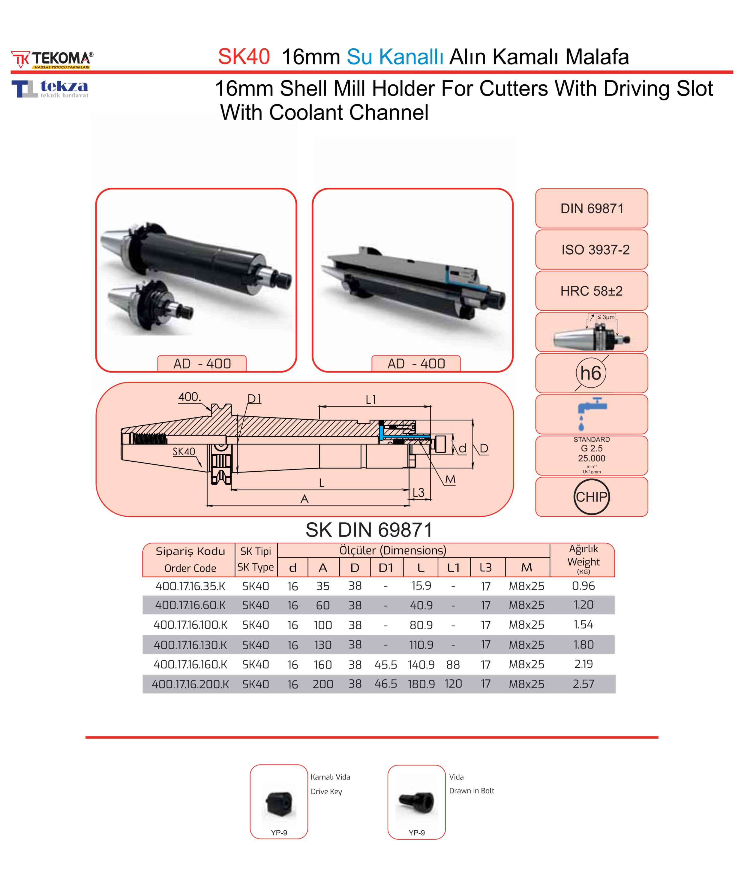 SK40 16mm Su Kanallı Alın Kamalı Malafa